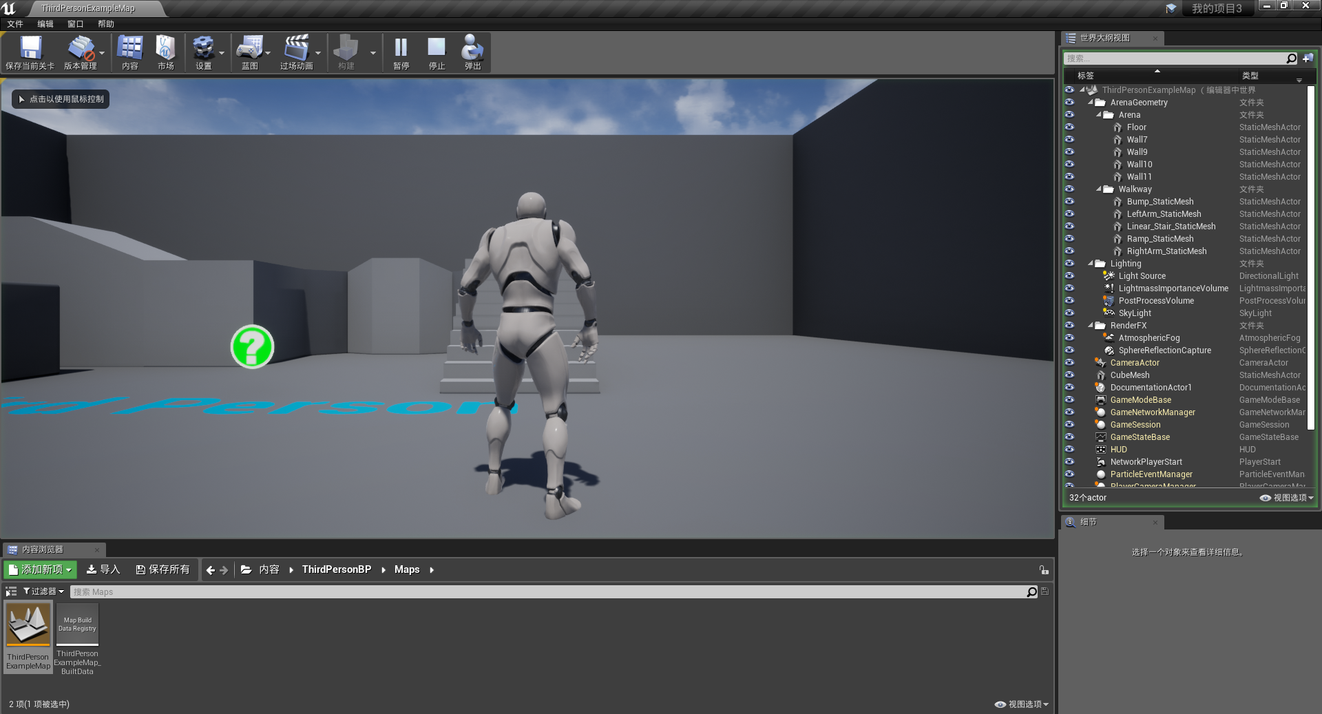 “细节(Details)”面板中会显示选中的项、组件及其属性。在“细节(Details)”面板上,可以更改属性值,添加组件,并将选中的项转换成蓝图,你还可以使用多个“细节(Details)”面板在多个项间匹配属性。